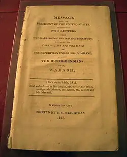 Au début, les journaux apportent peu d'informations sur la bataille, se focalisant plutôt sur les faits marquants des guerres napoléoniennes en cours. Un journal de Louisville a même imprimé une copie de la dépêche originale et annonce que la bataille est une défaite pour les États-Unis[25]. Cependant, au mois de décembre, la plupart des grands journaux des États-Unis commencent à rapporter des récits de la bataille. L'indignation du public croit rapidement et beaucoup de citoyens blâment les Britanniques pour avoir incité les tribus à la violence et leur avoir fourni des armes à feu. Andrew Jackson est à l'avant-garde de ceux appelant à la guerre, soutenant que Tecumseh et ses alliés étaient « agités par des agents secrets britanniques »[26]. D'autres gouverneurs de l'ouest appellent à l'action, Willie Blount du Tennessee appelle le gouvernement à « purger les camps d'Indiens de tout Anglais qui s'y trouverait […] »[27] Agissant sur le sentiment populaire, les « War hawk (en) » du Congrès font passer des résolutions condamnant les Britanniques pour leur ingérence dans les affaires intérieures des États-Unis. Tippecanoe a aggravé les tensions avec la Grande-Bretagne, culminant en une déclaration de guerre seulement quelques mois après[28].
