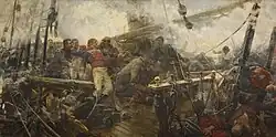 - ↑ Ce tableau appartient à une série de six toiles qui s'intitule Le Bucentaure à Trafalgar, consacrée au navire amiral français lors de la bataille. On le voit complètement démâté, en train de recevoir une salve du HMS Sandwich. En réalité, le peintre commet une erreur car le HMS Sandwich avait été retiré du service dès 1797. Il est admis que ce navire est en réalité le HMS Temeraire