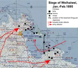 Les canons des fortifications terrestres maintenant aux mains des Japonais, et en position de tirer sur la flotte de Beiyang, la situation de l'amiral Ding Ruchang devient précaire. En outre, les Japonais réussissent le 4 février à enlever les barrières de protection de l'ancrage, permettant à leurs torpilleurs de faire des attaques nocturnes répétées sur les navires chinois. Le 7 février, une attaque de la flotte japonaise combinée endommage gravement le Dingyuen et coule trois autres navires en tirant onze torpilles Schwartzkopff[2]. Les équipages des torpilleurs chinois restants se mutinent et tentent de s'échapper vers Yentai, mais au total six bâtiments sont détruits et les sept autres capturés par les Japonais.