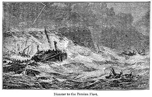 Au cours de la nuit, un orage éclate en provenance du mont Pélion[47] et empêche le départ d'un groupe de navires grecs qui doit intercepter le détachement perse chargé de contourner l'Eubée. Cependant, la tempête touche également la flotte perse au mouillage aux Aphètes et le détachement perse perd la plupart de ses navires[47].
