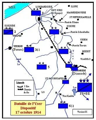 Le front français est solidement organisé jusqu'à La Bassée, mais, plus au nord, il n'y a que deux divisions territoriales françaises et les unités britanniques pour prolonger le front. Ces derniers prennent position dans la région d'Ypres d'où part l'Yperlée pour se jeter dans l'Yser en face de Fort Knokke. Le corps de cavalerie français du général de Mitry auquel s'est jointe la 1re division de cavalerie belge assurent la couverture une vingtaine de kilomètres à l'est de Fort Knokke.