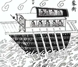 - ↑ La nature exacte de ces navires n'est pas claire. En 2006, Zhang Xiugui fait référence à eux comme « couverts de cuir de guerre d'agression », mais la référence est entre parenthèses. Dans une longue discussion, de Crespigny en 2004 sépare les deux termes, décrivant mengchong comme « couverts avec une certaine forme de protection du matériel servant à briser l'ennemi en ligne de bataille, et peut-être de nuire à leurs navires et les hommes avec un bélier, ou par des projectiles » et « doujian » en tant que « ... la lutte contre les plates-formes pour les archers et à s'engager dans le combat rapproché ... ». Il en conclut que « mengchong doujian » est une "description générale pour les navires de guerre".