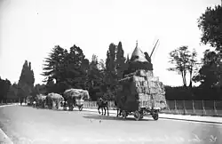 Convoi de fourrage arrivant dans le bois de Boulogne, où sont parqués des troupeaux de bovins : le camp retranché de Paris se prépare en catastrophe à un siège, rappelant celui de 1870.