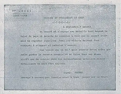 Puis Joffre informe le ministre de la Guerre Millerand, réfugié à Bordeaux devant la menace pesant sur Paris : « […] la lutte qui va s'engager peut avoir des résultats décisifs, mais peut aussi avoir pour le pays, en cas d'échec, les conséquences les plus graves. Je suis décidé à engager toutes nos troupes à fond et sans réserve […] »[35].