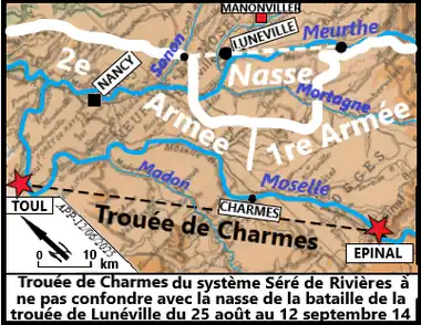 - Trouée de Lunéville de 27 km entre Crévic (sur le Sanon) et Baccarat (sur la Meurthe)