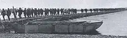 Les ingénieurs du génie japonais estiment que dix ponts d'environ 1,5 km chacun sont nécessaires pour enjamber le fleuve. Un tiers d'entre eux sont construits avec des pontons d'acier préfabriqués pesant 45 kg chacun[2]. Les autres sont construits avec les ressources locales. Disposant d'une vue complète sur les positions russes, les Japonais commencent la construction d'un terre-plein sur le fleuve Yalou qui est immédiatement la cible de deux batteries d'artillerie russes. Tandis qu'ils commencent à engager le combat, les Japonais préparent neuf autres ponts qui pourront être rapidement installés pour un assaut rapide à travers le fleuve en d'autres lieux.