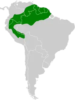 Cet oiseau se rencontre en Bolivie, au Brésil, en Colombie, en Équateur, au Guyana, en Guyane, au Pérou, au Suriname et au Venezuela[1].