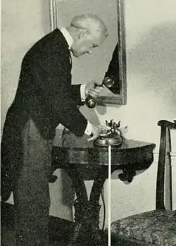 Orson Welles grimé en The Shadow. Photographie promotionnelle d'une adaptation radiophonique des aventures du justicier des pulps (vers 1937-1938).