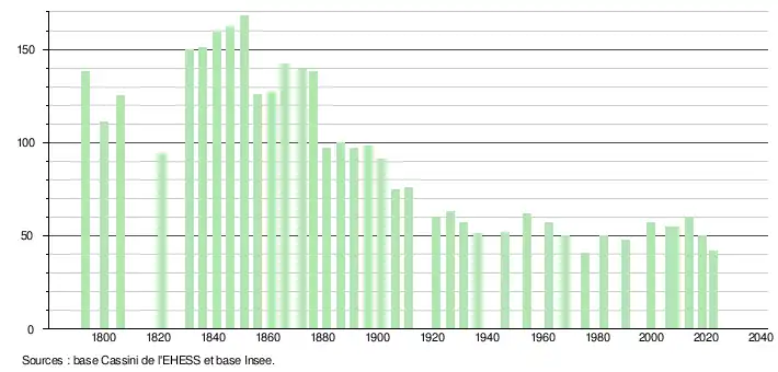 L'évolution du nombre d'habitants est connue à travers les recensements de la population effectués dans la commune depuis 1793. Pour les communes de moins de 10 000 habitants, une enquête de recensement portant sur toute la population est réalisée tous les cinq ans, les populations de référence des années intermédiaires étant quant à elles estimées par interpolation ou extrapolation[14]. Pour la commune, le premier recensement exhaustif entrant dans le cadre du nouveau dispositif a été réalisé en 2008[15].