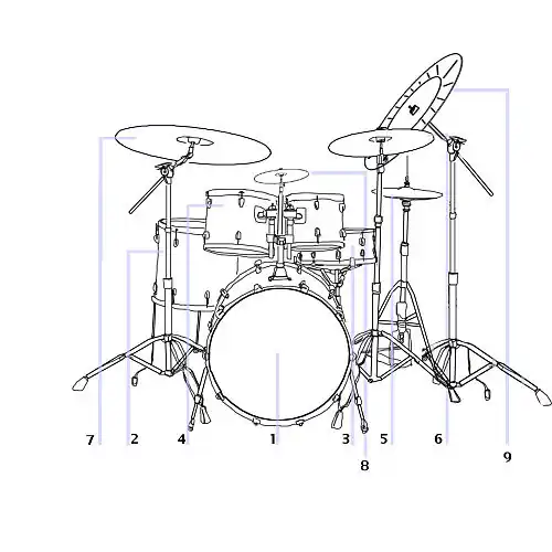 - ↑ Certains batteurs comme Terry Bozzio en utilisent couramment plus de vingt.