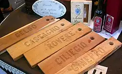 - Cerisier : bois poreux et parfumé, il transmet des arômes délicats au produit. Il a tendance à se déformer au cours du temps, et ne garantit pas l'étanchéité des tonneaux. Pour cette raison, il est souvent utilisé au début de la batteria.