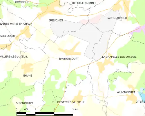 Au , Baudoncourt est catégorisée commune rurale à habitat dispersé, selon la nouvelle grille communale de densité à sept niveaux définie par l'Insee en 2022[8]. Elle appartient à l'unité urbaine de Luxeuil-les-Bains[Note 2], une agglomération intra-départementale regroupant six communes, dont elle est une commune de la banlieue[Note 3],[9],[10]. Par ailleurs la commune fait partie de l'aire d'attraction de Luxeuil-les-Bains, dont elle est une commune de la couronne[Note 4],[10]. Cette aire, qui regroupe 41 communes, est catégorisée dans les aires de moins de 50 000 habitants[11],[12].