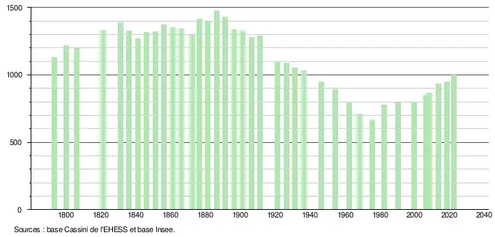 L'évolution du nombre d'habitants est connue à travers les recensements de la population effectués dans la commune depuis 1793. Pour les communes de moins de 10 000 habitants, une enquête de recensement portant sur toute la population est réalisée tous les cinq ans, les populations de référence des années intermédiaires étant quant à elles estimées par interpolation ou extrapolation[26]. Pour la commune, le premier recensement exhaustif entrant dans le cadre du nouveau dispositif a été réalisé en 2008[27].