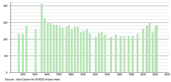 L'évolution du nombre d'habitants est connue à travers les recensements de la population effectués dans la commune depuis 1793. Pour les communes de moins de 10 000 habitants, une enquête de recensement portant sur toute la population est réalisée tous les cinq ans, les populations de référence des années intermédiaires étant quant à elles estimées par interpolation ou extrapolation[24]. Pour la commune, le premier recensement exhaustif entrant dans le cadre du nouveau dispositif a été réalisé en 2005[25].