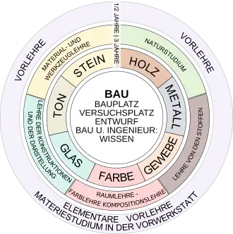 Dans la représentation schématique que fait Gropius en 1922 (voir ci-contre), l'enseignement est présenté sous la forme de trois cercles concentriques visant à atteindre l'étape ultime : la construction (der Bau). La première partie consiste en un cours préliminaire (Vorlehre) initialement de 6 mois. La seconde partie de 3 ans consiste en un travail d'atelier. Jusqu'en 1925[9], cet enseignement comporte deux volets : un enseignement de la forme (Formlehre), donné par un artiste, « maître de la forme » et un enseignement pratique (Werklehre), donné par un « maître artisan ». Dans le schéma ci-contre, chacun des ateliers correspond à un matériau : pierre (Stein), argile (Ton), verre (Glas), couleur (Farbe), tissu (Gewebe), métal (Metall) et bois (Holz). La dernière étape consacrée à la construction ne sera mise en place que plus tard et de manière différente.
