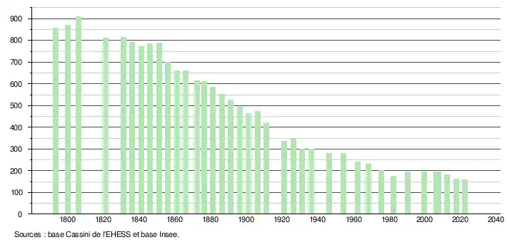 L'évolution du nombre d'habitants est connue à travers les recensements de la population effectués dans la commune depuis 1793. Pour les communes de moins de 10 000 habitants, une enquête de recensement portant sur toute la population est réalisée tous les cinq ans, les populations de référence des années intermédiaires étant quant à elles estimées par interpolation ou extrapolation[22]. Pour la commune, le premier recensement exhaustif entrant dans le cadre du nouveau dispositif a été réalisé en 2007[23].