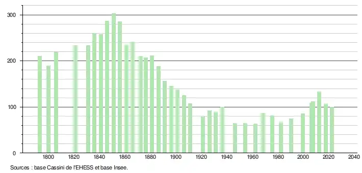 L'évolution du nombre d'habitants est connue à travers les recensements de la population effectués dans la commune depuis 1793. Pour les communes de moins de 10 000 habitants, une enquête de recensement portant sur toute la population est réalisée tous les cinq ans, les populations de référence des années intermédiaires étant quant à elles estimées par interpolation ou extrapolation[27]. Pour la commune, le premier recensement exhaustif entrant dans le cadre du nouveau dispositif a été réalisé en 2007[28].