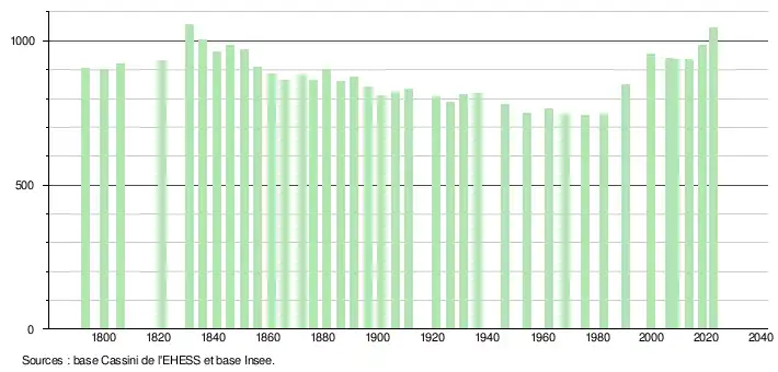 - ↑ Population municipale de référence en vigueur au 1er janvier 2025, millésimée 2022, définie dans les limites territoriales en vigueur au 1er janvier 2024, date de référence statistique : 1er janvier 2022.