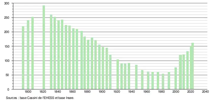 L'évolution du nombre d'habitants est connue à travers les recensements de la population effectués dans la commune depuis 1793. Pour les communes de moins de 10 000 habitants, une enquête de recensement portant sur toute la population est réalisée tous les cinq ans, les populations de référence des années intermédiaires étant quant à elles estimées par interpolation ou extrapolation[18]. Pour la commune, le premier recensement exhaustif entrant dans le cadre du nouveau dispositif a été réalisé en 2005[19].