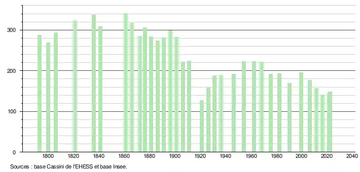 L'évolution du nombre d'habitants est connue à travers les recensements de la population effectués dans la commune depuis 1793. Pour les communes de moins de 10 000 habitants, une enquête de recensement portant sur toute la population est réalisée tous les cinq ans, les populations de référence des années intermédiaires étant quant à elles estimées par interpolation ou extrapolation[22]. Pour la commune, le premier recensement exhaustif entrant dans le cadre du nouveau dispositif a été réalisé en 2006[23].