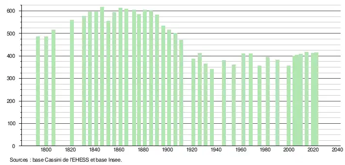 L'évolution du nombre d'habitants est connue à travers les recensements de la population effectués dans la commune depuis 1793. Pour les communes de moins de 10 000 habitants, une enquête de recensement portant sur toute la population est réalisée tous les cinq ans, les populations de référence des années intermédiaires étant quant à elles estimées par interpolation ou extrapolation[32]. Pour la commune, le premier recensement exhaustif entrant dans le cadre du nouveau dispositif a été réalisé en 2004[33].