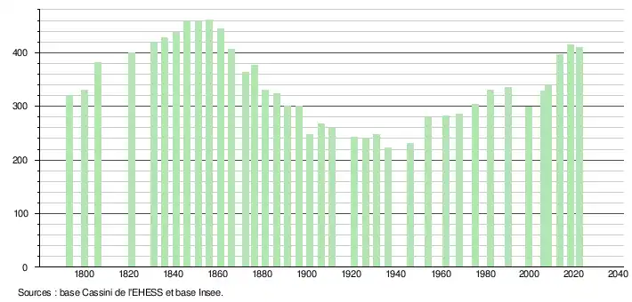L'évolution du nombre d'habitants est connue à travers les recensements de la population effectués dans la commune depuis 1793. Pour les communes de moins de 10000habitants, une enquête de recensement portant sur toute la population est réalisée tous les cinqans, les populations de référence des années intermédiaires étant quant à elles estimées par interpolation ou extrapolation[20]. Pour la commune, le premier recensement exhaustif entrant dans le cadre du nouveau dispositif a été réalisé en 2008[21].