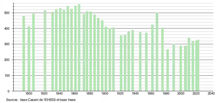 L'évolution du nombre d'habitants est connue à travers les recensements de la population effectués dans la commune depuis 1793. Pour les communes de moins de 10 000 habitants, une enquête de recensement portant sur toute la population est réalisée tous les cinq ans, les populations de référence des années intermédiaires étant quant à elles estimées par interpolation ou extrapolation[21]. Pour la commune, le premier recensement exhaustif entrant dans le cadre du nouveau dispositif a été réalisé en 2005[22].