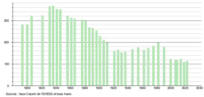 L'évolution du nombre d'habitants est connue à travers les recensements de la population effectués dans la commune depuis 1793. Pour les communes de moins de 10 000 habitants, une enquête de recensement portant sur toute la population est réalisée tous les cinq ans, les populations de référence des années intermédiaires étant quant à elles estimées par interpolation ou extrapolation[28]. Pour la commune, le premier recensement exhaustif entrant dans le cadre du nouveau dispositif a été réalisé en 2008[29].