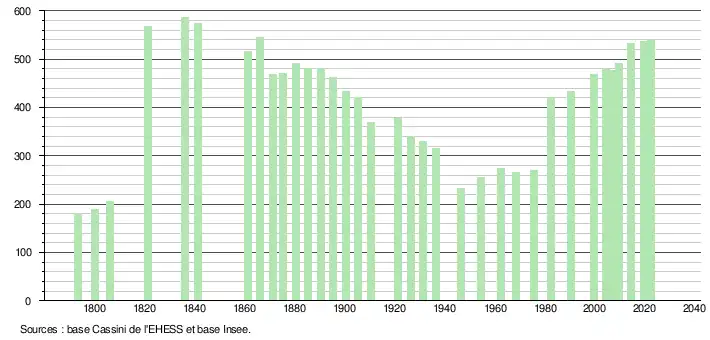 L'évolution du nombre d'habitants est connue à travers les recensements de la population effectués dans la commune depuis 1793. Pour les communes de moins de 10 000 habitants, une enquête de recensement portant sur toute la population est réalisée tous les cinq ans, les populations de référence des années intermédiaires étant quant à elles estimées par interpolation ou extrapolation[17]. Pour la commune, le premier recensement exhaustif entrant dans le cadre du nouveau dispositif a été réalisé en 2004[18].