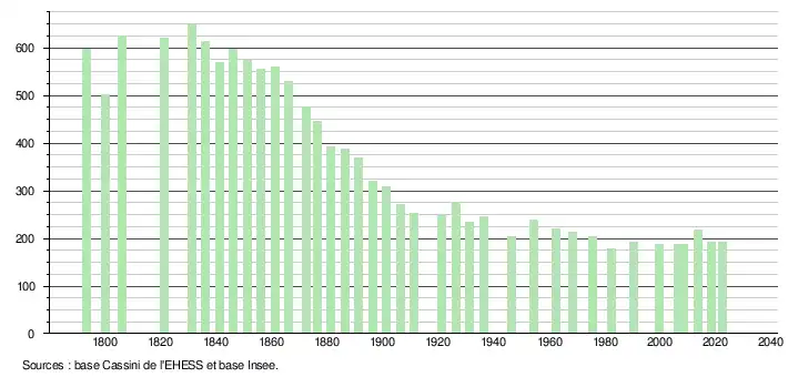 L'évolution du nombre d'habitants est connue à travers les recensements de la population effectués dans la commune depuis 1793. Pour les communes de moins de 10 000 habitants, une enquête de recensement portant sur toute la population est réalisée tous les cinq ans, les populations de référence des années intermédiaires étant quant à elles estimées par interpolation ou extrapolation[33]. Pour la commune, le premier recensement exhaustif entrant dans le cadre du nouveau dispositif a été réalisé en 2008[34].