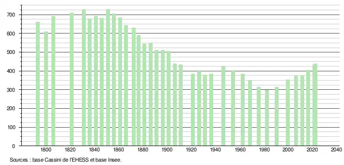 L'évolution du nombre d'habitants est connue à travers les recensements de la population effectués dans la commune depuis 1793. Pour les communes de moins de 10 000 habitants, une enquête de recensement portant sur toute la population est réalisée tous les cinq ans, les populations de référence des années intermédiaires étant quant à elles estimées par interpolation ou extrapolation[31]. Pour la commune, le premier recensement exhaustif entrant dans le cadre du nouveau dispositif a été réalisé en 2006[32].