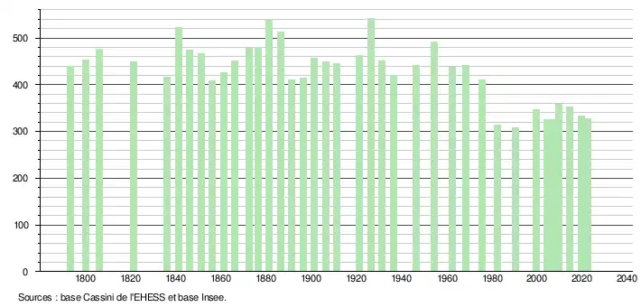 L'évolution du nombre d'habitants est connue à travers les recensements de la population effectués dans la commune depuis 1793. Pour les communes de moins de 10 000 habitants, une enquête de recensement portant sur toute la population est réalisée tous les cinq ans, les populations de référence des années intermédiaires étant quant à elles estimées par interpolation ou extrapolation[34]. Pour la commune, le premier recensement exhaustif entrant dans le cadre du nouveau dispositif a été réalisé en 2004[35].