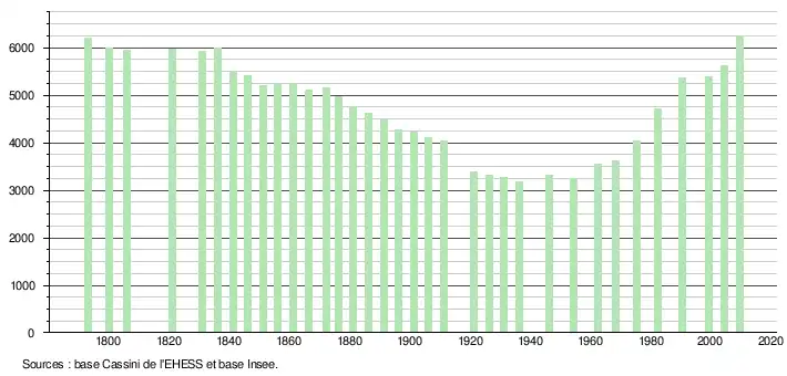 - ↑ Par convention dans Wikipédia, le principe a été retenu de n’afficher dans le tableau des recensements et le graphique, pour les populations légales postérieures à 1999, que les populations correspondant à une enquête exhaustive de recensement pour les communes de moins de 10 000 habitants, et que les populations des années 2006, 2011, 2016, etc. pour les communes de plus de 10 000 habitants, ainsi que la dernière population légale publiée par l’Insee pour l'ensemble des communes.