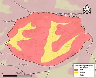 Le retrait-gonflement des sols argileux est susceptible d'engendrer des dommages importants aux bâtiments en cas d’alternance de périodes de sécheresse et de pluie. La totalité de la commune est en aléa moyen ou fort (88,8 % au niveau départemental et 48,5 % au niveau national). Sur les 169 bâtiments dénombrés sur la commune en 2019, 169 sont en aléa moyen ou fort, soit 100 %, à comparer aux 98 % au niveau départemental et 54 % au niveau national. Une cartographie de l'exposition du territoire national au retrait gonflement des sols argileux est disponible sur le site du BRGM[23],[Carte 3].