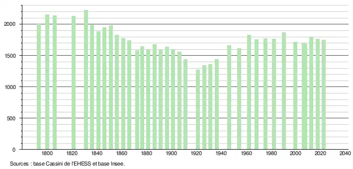 L'évolution du nombre d'habitants est connue à travers les recensements de la population effectués dans la commune depuis 1793. Pour les communes de moins de 10 000 habitants, une enquête de recensement portant sur toute la population est réalisée tous les cinq ans, les populations de référence des années intermédiaires étant quant à elles estimées par interpolation ou extrapolation[37]. Pour la commune, le premier recensement exhaustif entrant dans le cadre du nouveau dispositif a été réalisé en 2007[38].