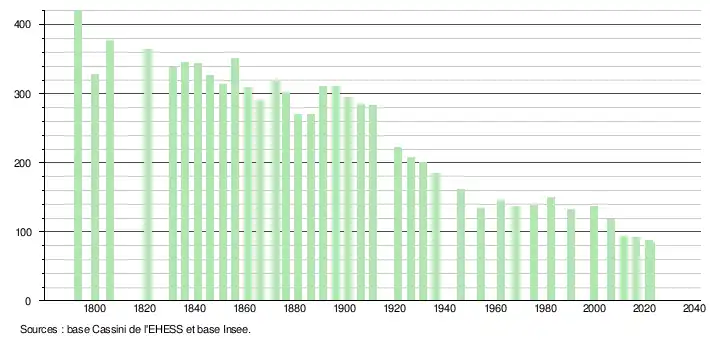L'évolution du nombre d'habitants est connue à travers les recensements de la population effectués dans la commune depuis 1793. Pour les communes de moins de 10 000 habitants, une enquête de recensement portant sur toute la population est réalisée tous les cinq ans, les populations de référence des années intermédiaires étant quant à elles estimées par interpolation ou extrapolation[15]. Pour la commune, le premier recensement exhaustif entrant dans le cadre du nouveau dispositif a été réalisé en 2006[16].