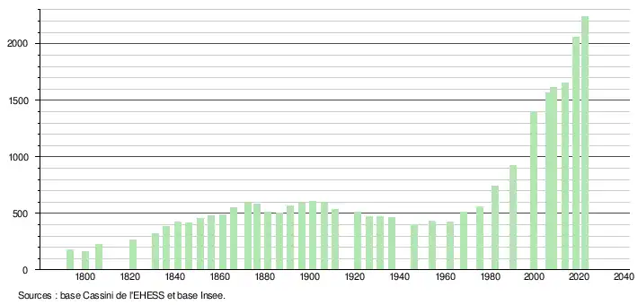 L'évolution du nombre d'habitants est connue à travers les recensements de la population effectués dans la commune depuis 1793. Pour les communes de moins de 10 000 habitants, une enquête de recensement portant sur toute la population est réalisée tous les cinq ans, les populations de référence des années intermédiaires étant quant à elles estimées par interpolation ou extrapolation[26]. Pour la commune, le premier recensement exhaustif entrant dans le cadre du nouveau dispositif a été réalisé en 2008[27].