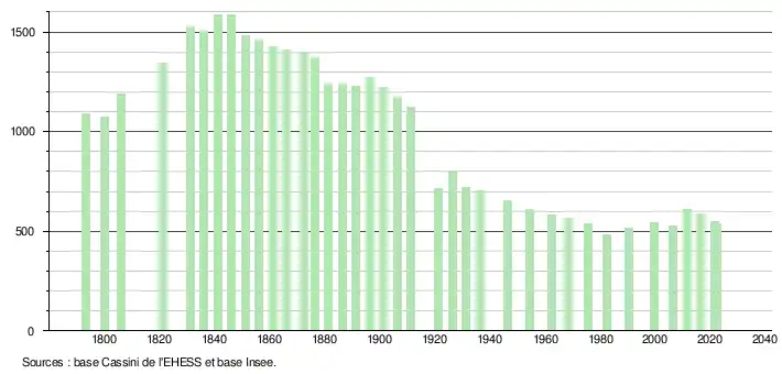 L'évolution du nombre d'habitants est connue à travers les recensements de la population effectués dans la commune depuis 1793. Pour les communes de moins de 10 000 habitants, une enquête de recensement portant sur toute la population est réalisée tous les cinq ans, les populations de référence des années intermédiaires étant quant à elles estimées par interpolation ou extrapolation[32]. Pour la commune, le premier recensement exhaustif entrant dans le cadre du nouveau dispositif a été réalisé en 2006[33].