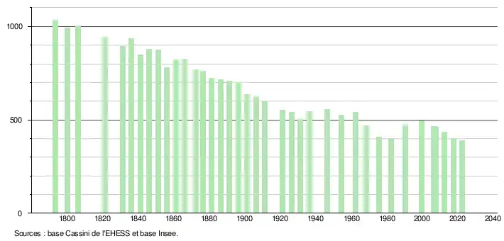 L'évolution du nombre d'habitants est connue à travers les recensements de la population effectués dans la commune depuis 1793. Pour les communes de moins de 10 000 habitants, une enquête de recensement portant sur toute la population est réalisée tous les cinq ans, les populations de référence des années intermédiaires étant quant à elles estimées par interpolation ou extrapolation[21]. Pour la commune, le premier recensement exhaustif entrant dans le cadre du nouveau dispositif a été réalisé en 2007[22].