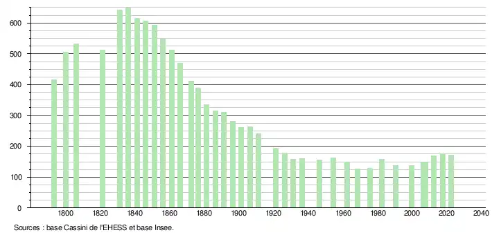L'évolution du nombre d'habitants est connue à travers les recensements de la population effectués dans la commune depuis 1793. Pour les communes de moins de 10 000 habitants, une enquête de recensement portant sur toute la population est réalisée tous les cinq ans, les populations de référence des années intermédiaires étant quant à elles estimées par interpolation ou extrapolation[27]. Pour la commune, le premier recensement exhaustif entrant dans le cadre du nouveau dispositif a été réalisé en 2007[28].