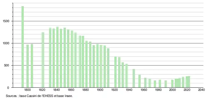 L'évolution du nombre d'habitants est connue à travers les recensements de la population effectués dans la commune depuis 1793. Pour les communes de moins de 10 000 habitants, une enquête de recensement portant sur toute la population est réalisée tous les cinq ans, les populations de référence des années intermédiaires étant quant à elles estimées par interpolation ou extrapolation[15]. Pour la commune, le premier recensement exhaustif entrant dans le cadre du nouveau dispositif a été réalisé en 2004[16].
