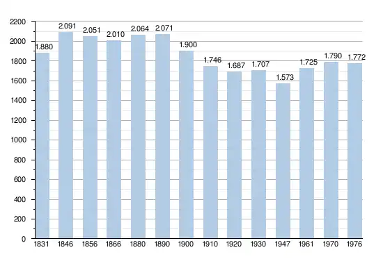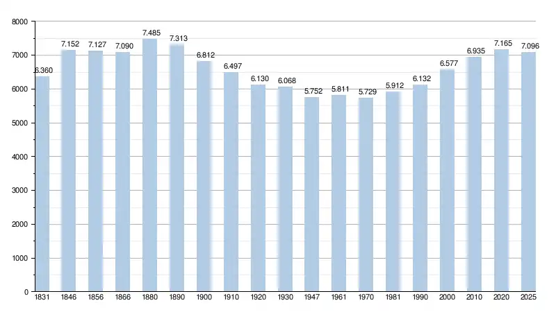 Les chiffres des années 1831 à 1970 tiennent compte des chiffres des anciennes communes fusionnées.