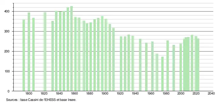 L'évolution du nombre d'habitants est connue à travers les recensements de la population effectués dans la commune depuis 1793. Pour les communes de moins de 10 000 habitants, une enquête de recensement portant sur toute la population est réalisée tous les cinq ans, les populations de référence des années intermédiaires étant quant à elles estimées par interpolation ou extrapolation[24]. Pour la commune, le premier recensement exhaustif entrant dans le cadre du nouveau dispositif a été réalisé en 2004[25].