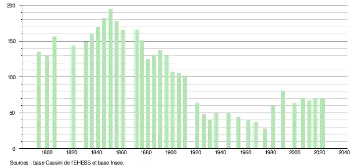 L'évolution du nombre d'habitants est connue à travers les recensements de la population effectués dans la commune depuis 1793. Pour les communes de moins de 10 000 habitants, une enquête de recensement portant sur toute la population est réalisée tous les cinq ans, les populations de référence des années intermédiaires étant quant à elles estimées par interpolation ou extrapolation[23]. Pour la commune, le premier recensement exhaustif entrant dans le cadre du nouveau dispositif a été réalisé en 2006[24].