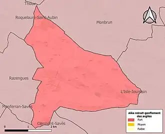 Le retrait-gonflement des sols argileux est susceptible d'engendrer des dommages importants aux bâtiments en cas d’alternance de périodes de sécheresse et de pluie. La totalité de la commune est en aléa moyen ou fort (94,5 % au niveau départemental et 48,5 % au niveau national). Sur les 76 bâtiments dénombrés sur la commune en 2019, 76 sont en aléa moyen ou fort, soit 100 %, à comparer aux 93 % au niveau départemental et 54 % au niveau national. Une cartographie de l'exposition du territoire national au retrait gonflement des sols argileux est disponible sur le site du BRGM[18],[Carte 3].