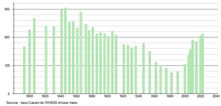 L'évolution du nombre d'habitants est connue à travers les recensements de la population effectués dans la commune depuis 1793. Pour les communes de moins de 10 000 habitants, une enquête de recensement portant sur toute la population est réalisée tous les cinq ans, les populations de référence des années intermédiaires étant quant à elles estimées par interpolation ou extrapolation[24]. Pour la commune, le premier recensement exhaustif entrant dans le cadre du nouveau dispositif a été réalisé en 2004[25].