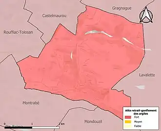 Le retrait-gonflement des sols argileux est susceptible d'engendrer des dommages importants aux bâtiments en cas d’alternance de périodes de sécheresse et de pluie. 99,2 % de la superficie communale est en aléa moyen ou fort (88,8 % au niveau départemental et 48,5 % au niveau national). Sur les 450 bâtiments dénombrés sur la commune en 2019, 450 sont en aléa moyen ou fort, soit 100 %, à comparer aux 98 % au niveau départemental et 54 % au niveau national. Une cartographie de l'exposition du territoire national au retrait gonflement des sols argileux est disponible sur le site du BRGM[21],[Carte 3].