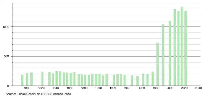 L'évolution du nombre d'habitants est connue à travers les recensements de la population effectués dans la commune depuis 1793. Pour les communes de moins de 10 000 habitants, une enquête de recensement portant sur toute la population est réalisée tous les cinq ans, les populations de référence des années intermédiaires étant quant à elles estimées par interpolation ou extrapolation[26]. Pour la commune, le premier recensement exhaustif entrant dans le cadre du nouveau dispositif a été réalisé en 2006[27].