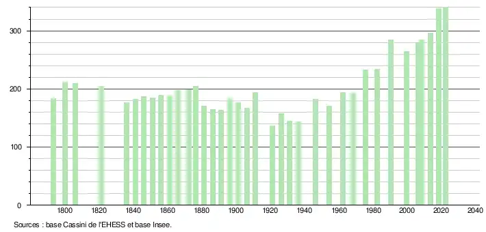 L'évolution du nombre d'habitants est connue à travers les recensements de la population effectués dans la commune depuis 1793. Pour les communes de moins de 10 000 habitants, une enquête de recensement portant sur toute la population est réalisée tous les cinq ans, les populations de référence des années intermédiaires étant quant à elles estimées par interpolation ou extrapolation[32]. Pour la commune, le premier recensement exhaustif entrant dans le cadre du nouveau dispositif a été réalisé en 2008[33].