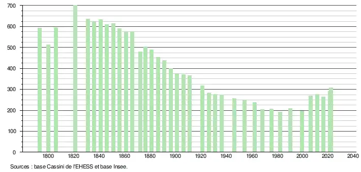 - ↑ Population municipale de référence en vigueur au 1er janvier 2025, millésimée 2022, définie dans les limites territoriales en vigueur au 1er janvier 2024, date de référence statistique : 1er janvier 2022.